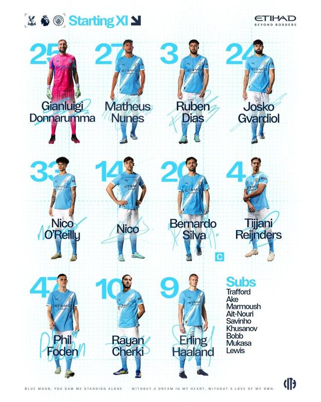 曼城首发:25-多纳鲁马、27-马特乌斯-努内斯、3-鲁本-迪亚斯、24-格瓦迪奥尔、33-尼科-奥赖利、14-尼科-冈萨雷斯、20-伯纳多-席尔瓦、4-赖因德斯、47-福登、10-谢尔基、9-哈兰德