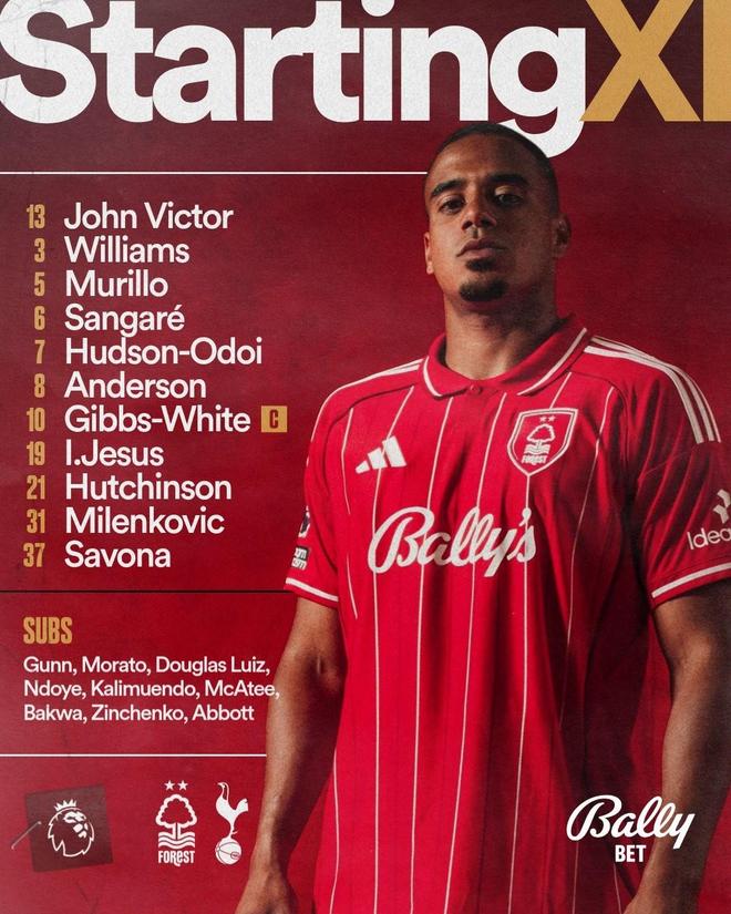 诺丁汉森林首发:13-约翰-维克托、3-内科-威廉斯、5-穆里略、31-米伦科维奇、37-萨沃纳、6-桑加雷、8-埃利奥特-安德森、21-哈钦森、10-吉布斯-怀特、7-奥多伊、19-伊戈尔-热苏斯